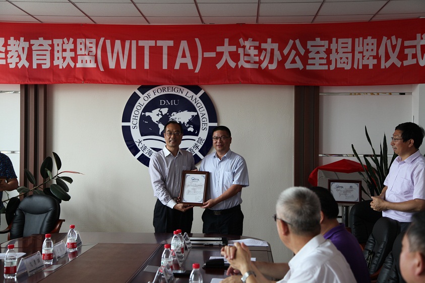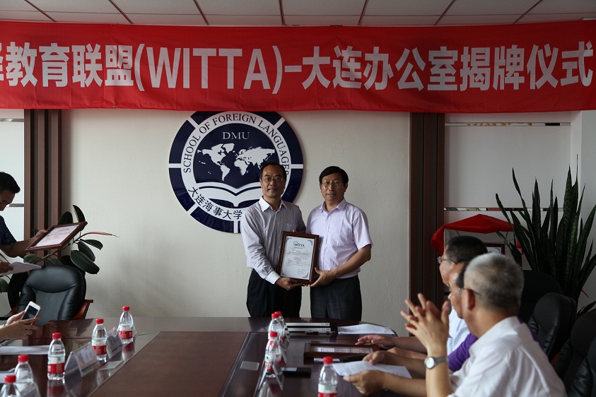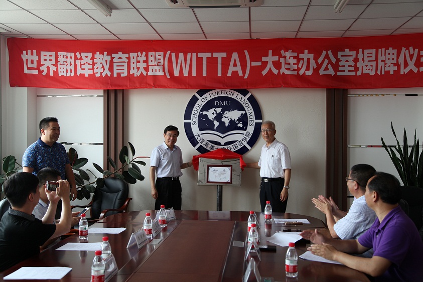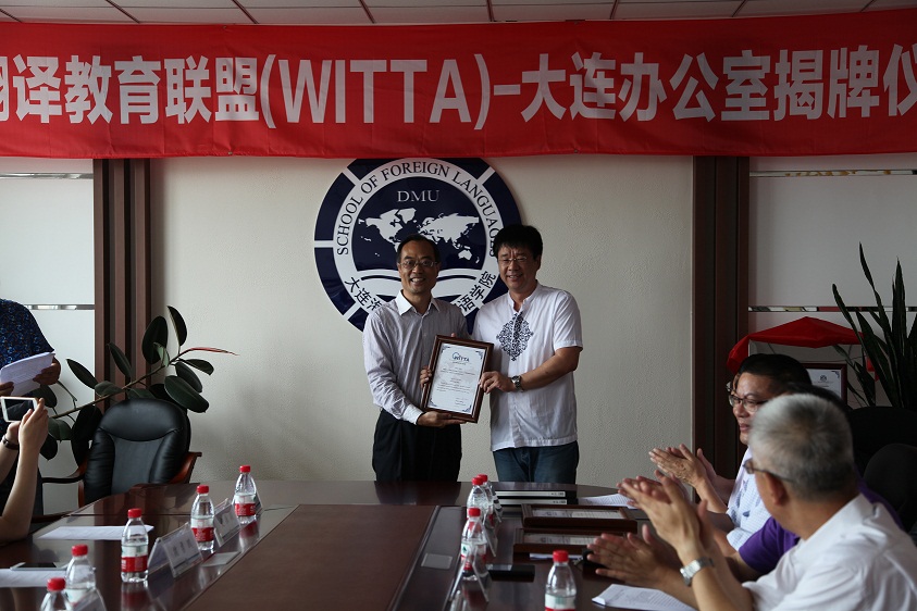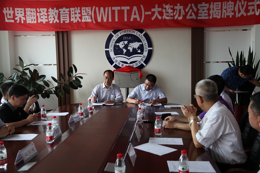 2017年7月5日,世界翻译教育联盟(World Interpreter and Translator Training Association,简称WITTA)联合特色高校开展“政产学研”集成创新战略合作暨组建WITTA大连办公室框架协议签字仪式、世界翻译教育联盟(WITTA)-大连办公室揭牌仪式暨世界翻译教育联盟翻译学科(专业)大数据课程资源建设专家委员会专家聘任仪式在437bwin必赢国际官网502会议室隆重举行。出席仪式的领导和嘉宾有:437bwin必赢国际官网副校长孙培廷,国务院学位委员会委员、全国翻译硕士专业学位研究生教育指导委员会主任委员、中国翻译协会常务副会长、世界翻译教育联盟战略顾问黄友义,世界翻译教育联盟秘书长、全国翻译硕士专业学位研究生教育指导委员会秘书长、广东外语外贸大学高级翻译学院院长赵军峰,世界翻译教育联盟常务副秘书长麦文,世界翻译教育联盟秘书处秘书吴怡婷,北京语智云帆科技有限公司首席技术官魏勇鹏,上海佑译信息科技有限公司销售总监史振羽,上海一者信息技术有限公司运营经理刘宁赫,437bwin必赢国际官网质量管理处处长兼教务处处长吴桂涛、研究生院副院长符策、一带一路研究院副院长兼航海历史与文化战略研究中心主任韩庆,437bwin必赢国际官网院长徐斌、党委书记曹印、副院长刘迎春。437bwin必赢国际官网副校长孙培廷和世界翻译教育联盟战略顾问黄友义为世界翻译教育联盟(WITTA)-大连办公室揭牌,黄友义向437bwin必赢国际官网院长徐斌授牌,世界翻译教育联盟秘书长赵军峰与437bwin必赢国际官网院长徐斌共同签署了世界翻译教育联盟(WITTA)联合特色高校开展“政产学研”集成创新战略合作暨组建WITTA大连办公室框架协议。上海海事大学、中国民航大学等交通运输类高校和辽宁省内共10余所高校的437bwin必赢国际官网院长、MTI教育负责人参加了仪式,仪式由世界翻译教育联盟常务副秘书长麦文主持。