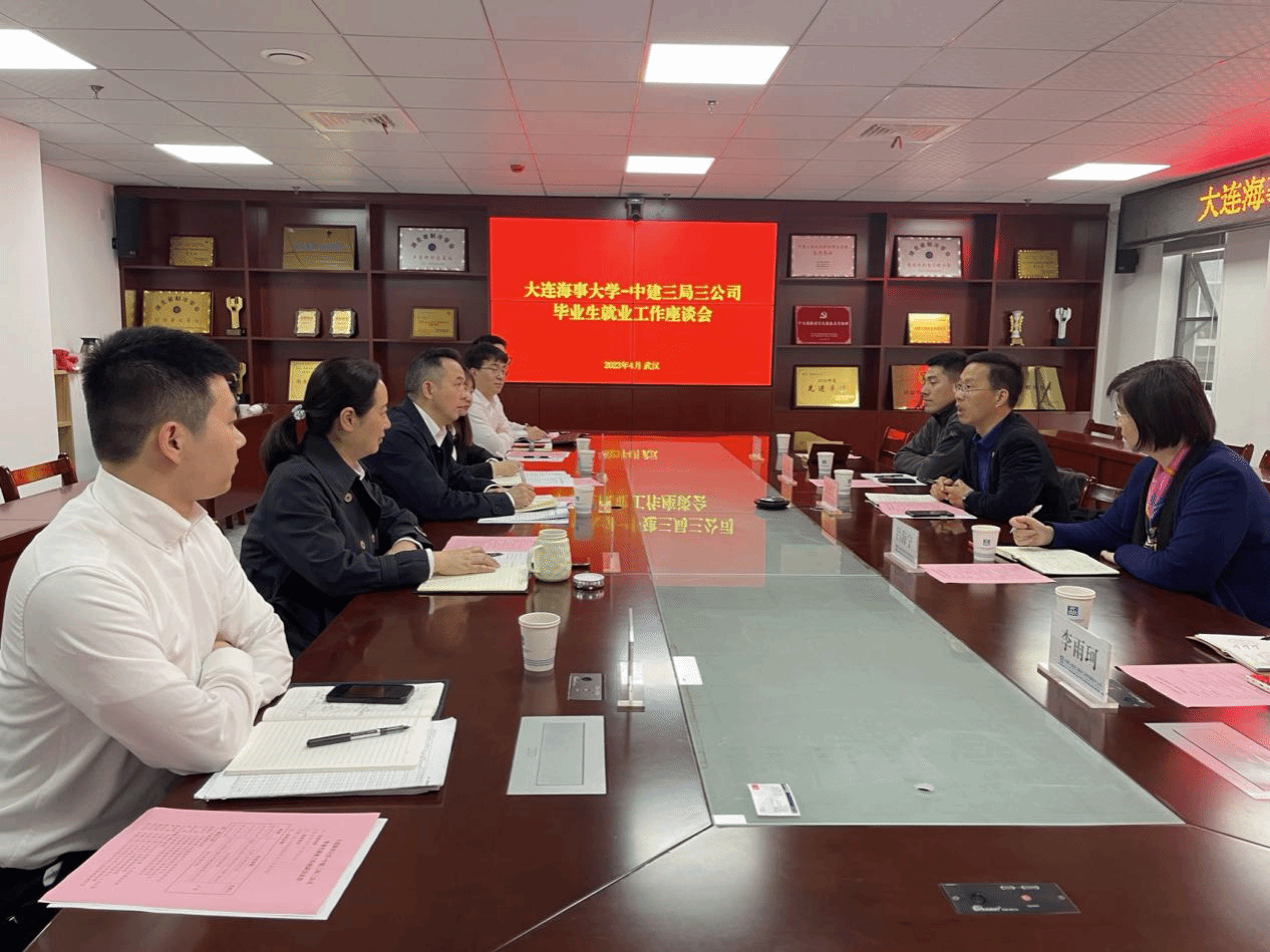 在中建三局三公司座谈中,人力资源部经理程亚军对参会人员进行介绍后,观看了中建三局三公司2022年度记忆及“寻根”宣传片,让海事一行对中建三局的公司起源、企业文化、企业发展有了直观的了解,随后人力资源部副经理严青介绍了公司校园招聘需求及计划,徐德江和吕海宁分别介绍了学院专业设置、人才培养及毕业生情况,座谈会上,双方就用人需求、培养理念、学生实习实践等方面进行了交流。